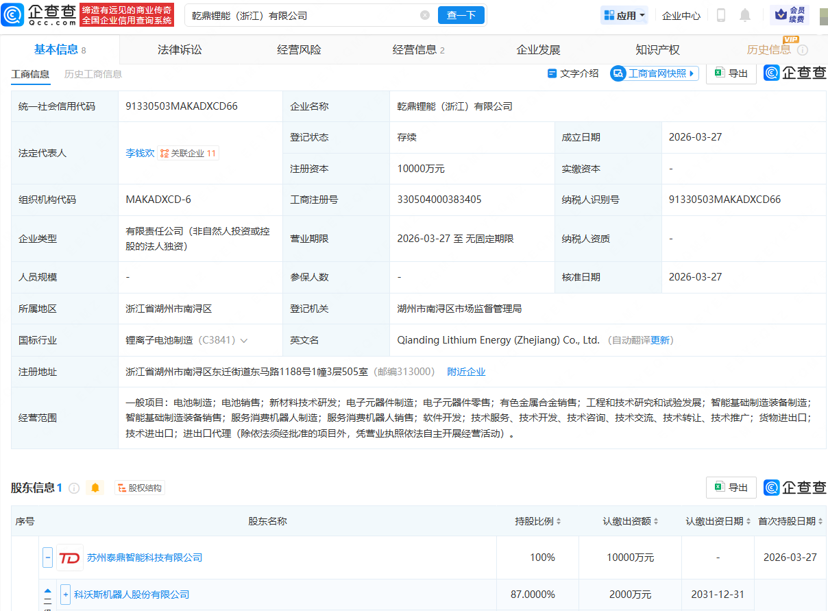 近日,乾鼎锂能(浙江)有限公司成立,法定代表人为李钱欢,注册资本为1亿元,经营范围包含:电池制造;电池销售;新材料技术研发;电子元器件制造;电子元器件零售;服务消费机器人制造等。企查查股权穿透显示,该公司由科沃斯(603486)控股的苏州泰鼎智能科技有限公司全资持股。