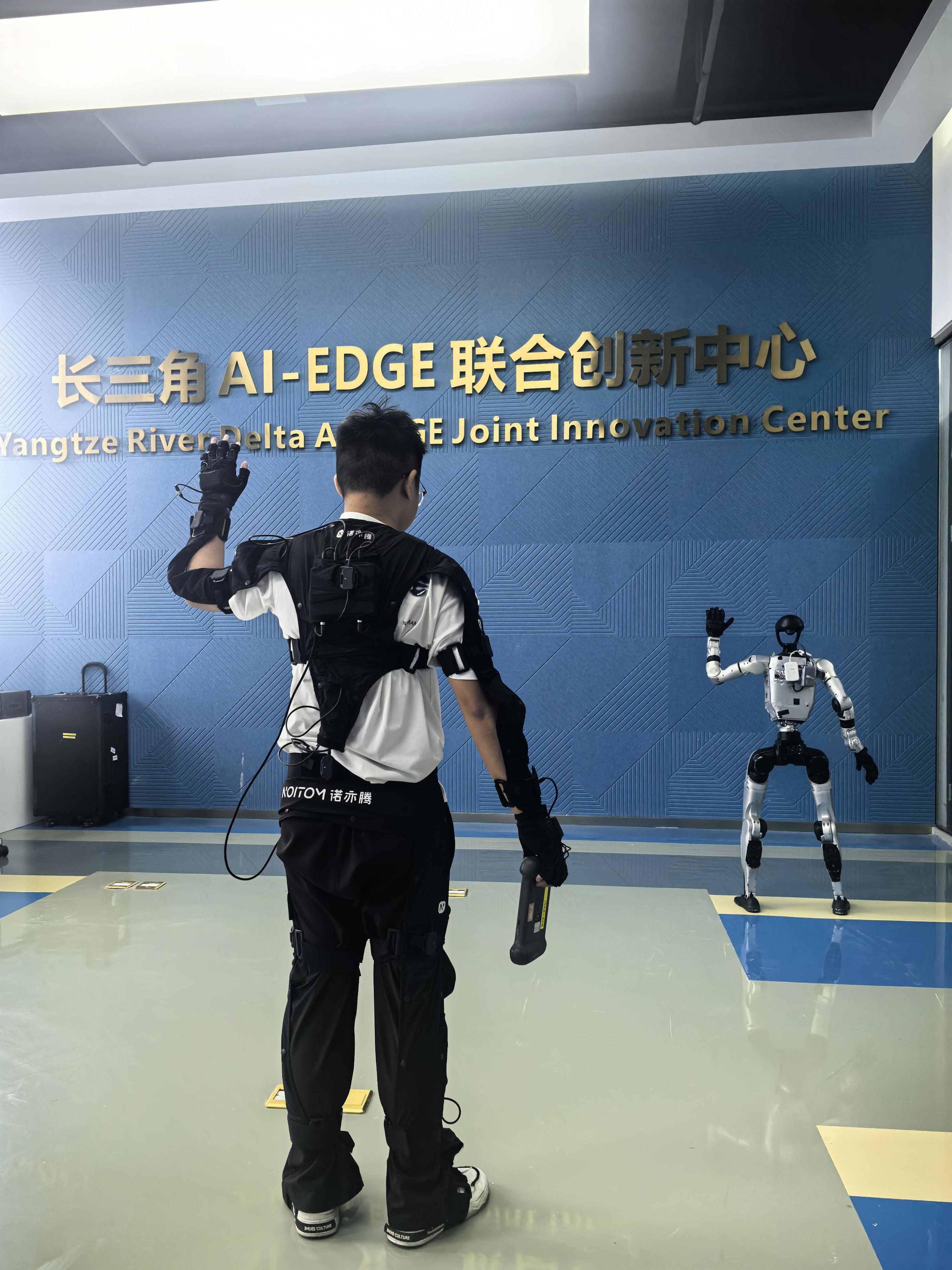 在长三角AI-EDGE联合创新中心的实验室中,只见一位科研人员在场地中不时快速移动脚步并来回腾跃,在他身旁,一个具身智能机器人几乎同时做出同样的动作。