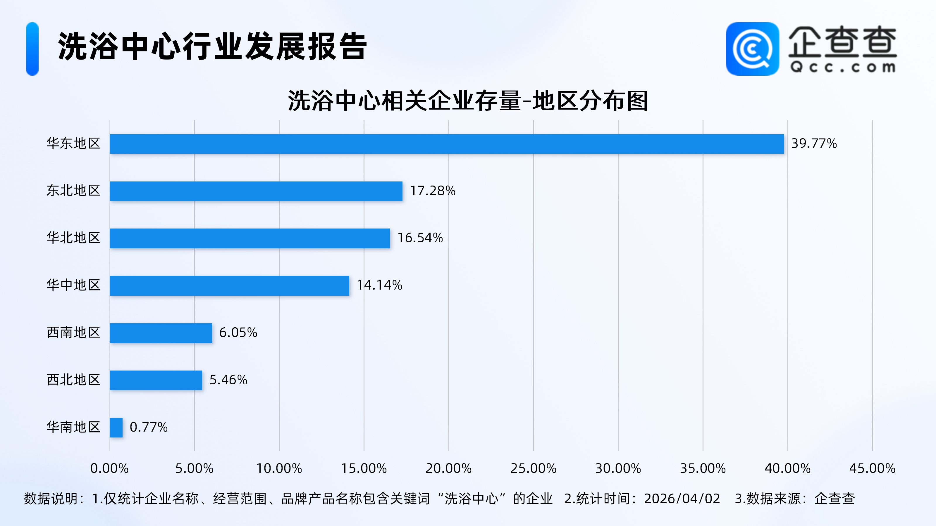 企查查数据显示,截至4月2日,国内现存2.65万家洗浴中心相关企业。近十年我国洗浴中心相关企业年末存量呈稳定增长态势,2016年末企业存量为1.52万家,2025年末增长至2.63万家,较十年前增长73.03%。从企业成立年限分布来看,现存的洗浴中心相关企业多为成熟企业,成立年限在5-10年的企业占比最高,达38.95%。地区分布上,华东地区相关企业存量最多,其次是东北、华北地区。注册量方面,2025年全年注册2018家相关企业,截至目前,今年已注册306家。